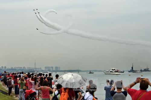 Người dân Singapore theo dõi màn trình diễn máy bay chiến đấu F16 của đội bay nhào lộn Không quân Singapore. Ảnh: AFP/TTXVN