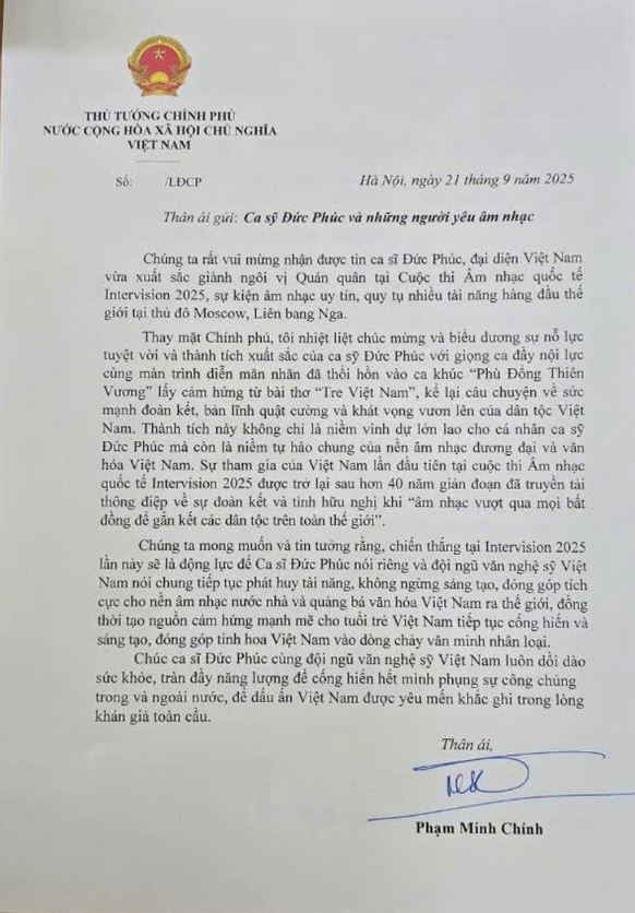 Nhận được tin ca sĩ Đức Phúc - đại diện Việt Nam xuất sắc giành ngôi vị quán quân tại cuộc thi âm nhạc quốc tế Intervision 2025 vào tối 20-9 (giờ Nga), Thủ tướng Chính phủ Phạm Minh Chính đã gửi thư chúc mừng và biểu dương sự nỗ lực tuyệt vời và thành tích xuất sắc của nghệ sĩ.