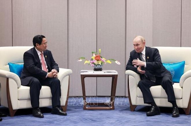 Thủ tướng Phạm Minh Chính gặp Tổng thống Nga Vladimir Putin. Ảnh: Dương Giang/TTXVN