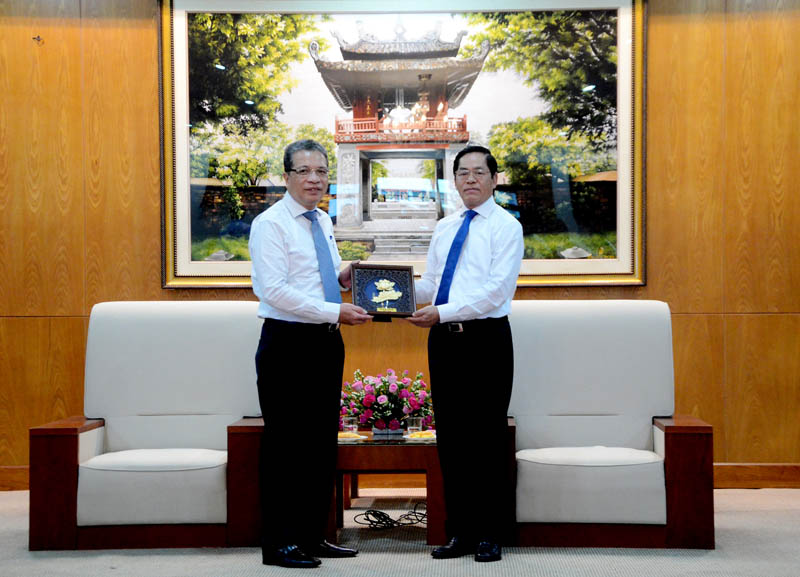Ông Phạm Viết Thanh, Ủy viên Trung ương Đảng, Bí thư Tỉnh ủy tặng quà lưu niệm Thứ trưởng Bộ Ngoại giao Đặng Minh Khôi.