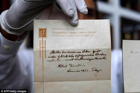 Lời nhắn thiên tài Albert Einstein tặng một người đưa thư ở Tokyo ghi lại ngắn gọn 'công thức' sống hạnh phúc vừa được bán đấu giá ở Jerusalem với giá 1,56 triệu USD (tương đương với gần 35,5 tỷ VNĐ), Dailymail dẫn lời nhà đấu giá cho biết hôm 25/10.