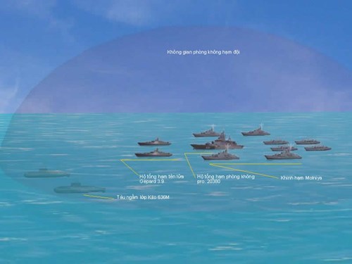 Phòng không tầm xa, phòng không tầm trung, phòng không tầm gần và cận gần, phòng tuyến chống ngầm. Do vũ khí tấn công hiện đại chủ yếu là tên lửa hành trình các tầm bay và các tốc độ khác nhau, do đó, khả năng bảo vệ lực lượng phòng ngự trên biển và hải đảo chủ yếu dựa vào phòng không, chống ngầm và cơ động liên tục trong một đội hình tác chiến thống nhất. Đòn phản công đánh thiệt hại đối phương sẽ là các khinh hạm tên lửa có tốc độ cao như Molniya.