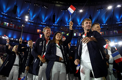 Đoàn vận động viên Pháp trong trang phục Lacoste diễu hành tại lễ khai mạc Thế vận hội mùa hè, Rio 2016.