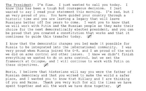Bản chép cuộc điện thoại ông Clinton gọi Yeltsin ngày 31.12.1999, ngày cựu Tổng thống Nga từ chức.