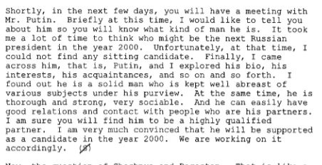 "Ông đã dẫn dắt đất nước đi qua một thời điểm lịch sử và ông đang để lại một di sản để Nga có thể phát triển mạnh mẽ trong những năm tiếp theo" - ông Clinton nói với cựu Tổng thống Boris Yeltsin trong cuộc điện đàm ngày 31.12.1999 - ngày ông Yeltsin bất ngờ tuyên bố từ chức.