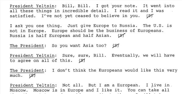 Gần 600 trang bản ghi các cuộc gặp và điện đàm giữa cựu Tổng thống Mỹ Bill Clinton và cựu Tổng thống Nga Boris Yelsin vẽ nên một bức tranh về thời điểm phương Tây thích Nga.