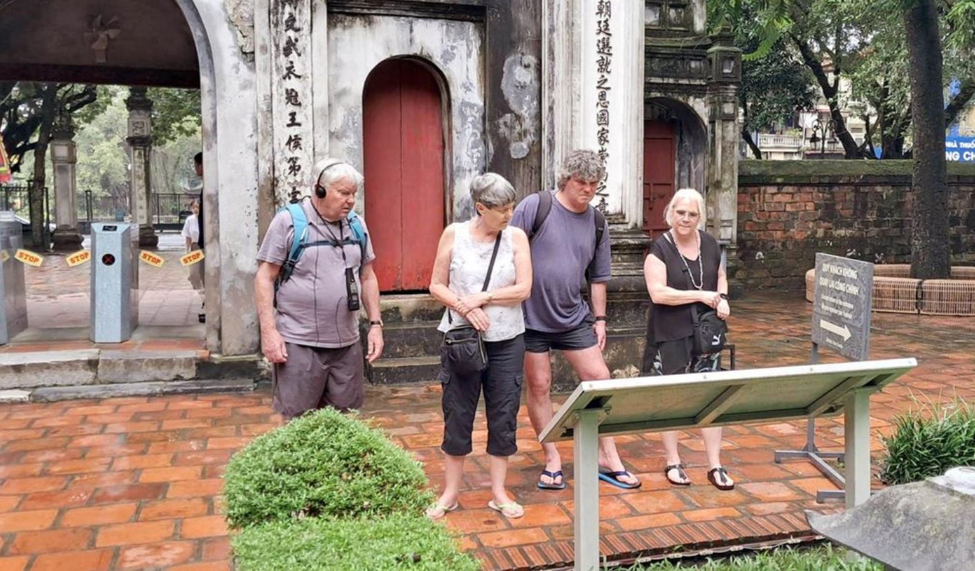 Khách du lịch Nga tham quan Văn Miếu-Quốc Tử Giám. Ảnh: Hoài Nam