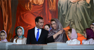 Như hàng năm, Thủ tướng Chính phủ Nga Dmitry Medvedev và phu nhân cũng có mặt dự thánh lễ tại Nhà thờ Đấng Cứu Thế Matxcova.
