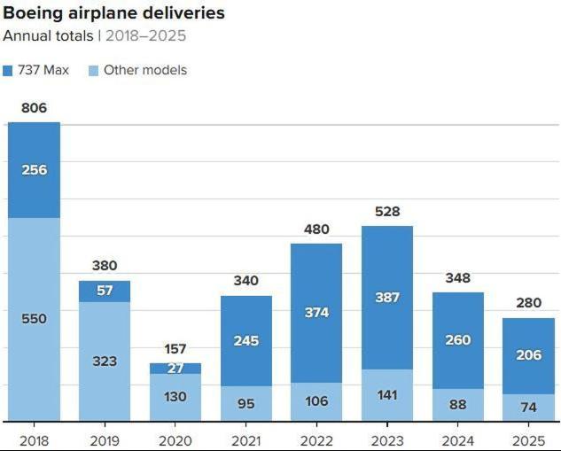 Số lượng máy bay Boeing được bàn giao từ năm 2018 đến 6 tháng đầu năm 2025. Ảnh: CNBC.