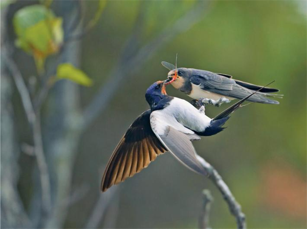 Trong lúc dạy đứa con nhỏ tập bay, chim én mẹ vẫn không quên mớm mồi cho nó.