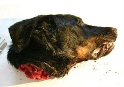 Chiếc đầu chó sẽ được lấy các bộ phận để ghép vào khuôn mặt của chàng trai trên.