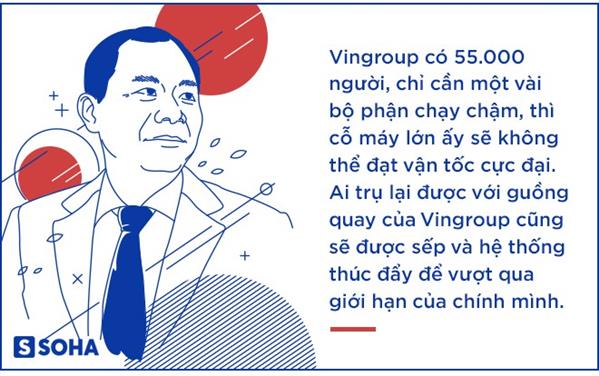 Ông Vượng luôn nói với thuộc cấp, Vingroup có 55.000 người, chỉ cần một vài bộ phận chạy chậm, thì cỗ máy lớn ấy sẽ không thể đạt vận tốc cực đại. Ai trụ lại được với guồng quay của Vingroup cũng sẽ được sếp và hệ thống thúc đẩy để vượt qua giới hạn của chính mình. “Không gì là không thể” là một trong những câu nói thường gặp nhất ở Vingroup.