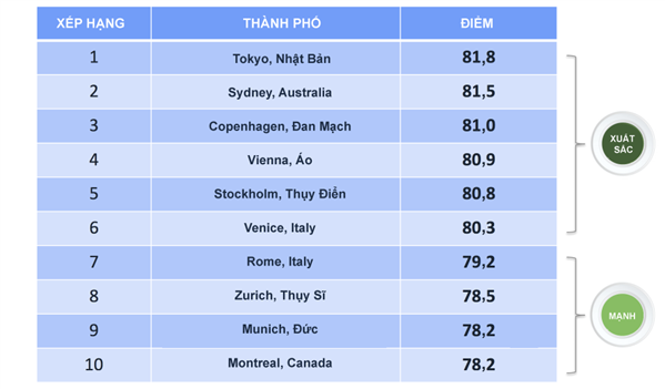 Thế giới có 6 thành phố với danh tiếng xuất sắc trong năm nay (trên 80 điểm), gấp 3 lần con số năm 2017. Trong top 10, Copenhagen được công nhận là thành phố an toàn nhất.