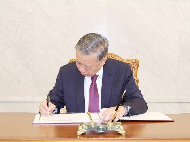 Tổng Bí thư Tô Lâm ghi sổ lưu niệm tại Cung Thái Dương ở Thủ đô Bình Nhưỡng.