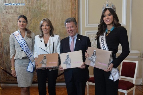 Tổng thống Juan Manuel Santos chụp ảnh cùng Cựu Hoa hậu Hoàn vũ 2014 và Hoa hậu Hoàn vũ Colombia 2015