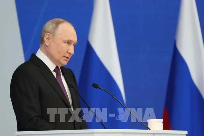 Tổng thống Nga Vladimir Putin trình bày Thông điệp liên bang tại Moskva ngày 29/2/2024. Ảnh: AFP/TTXVN.