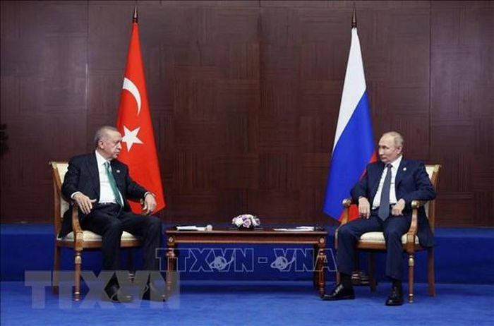 Tổng thống Nga Vladimir Putin (phải) và người đồng cấp Thổ Nhĩ Kỳ Recep Tayyip Erdogan tại cuộc gặp ở Astana, Kazakhstan ngày 13/10/2022. (Ảnh: AFP/TTXVN).