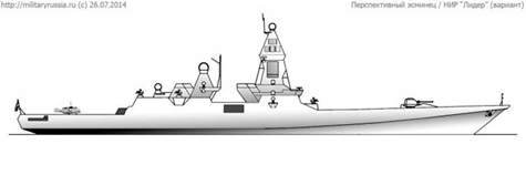 Hình ảnh giả định của tàu khu trục lớp Projekt 23560E Lider vào giữa năm 2015 (forums.airbase.ru).Khu trục hạm tên lửa thế hệ mới khổng lồ lớp Projekt 23560 Lider có lượng giãn nước gần 17.500 tấn, chiều dài 200 m, chiều rộng 20 m, tốc độ đến 30 hải lý/h và thời gian hoạt động độc lập là đến 90 ngày đêm.