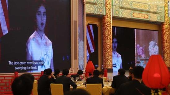Video cháu gái Tổng thống Trump - Arabella, con gái của Ivanka Trump và Jared Kushner trổ tài hát tiếng Trung Quốc được trình chiếu trước các quan khách tại quốc yến. Trước đó, hôm 8/11, Chủ tịch Trung Quốc cùng phu nhân đã hết lời khen ngợi khả năng phát âm tiếng Trung của Arabella và gọi cô bé là một ngôi sao nhí. Ảnh: AP