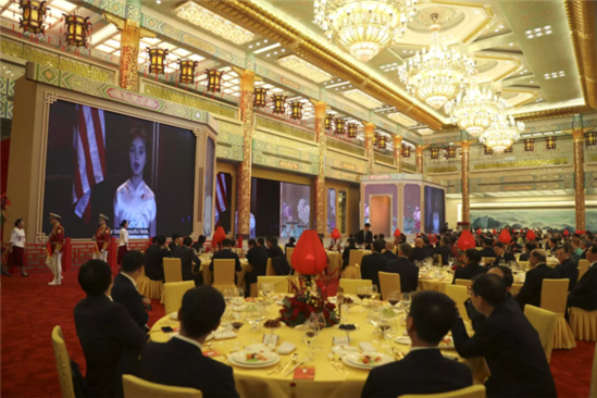 Quốc yến mở đầu bằng video ghi lại chuyến thăm Mỹ của Chủ tịch Tập hồi đầu năm và chuyến thăm Trung Quốc kéo dài hai ngày của Tổng thống Trump. Ảnh: AP