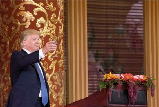Quốc yến chào mừng Tổng thống Mỹ Donald Trump và Đệ nhất Phu nhân Melania Trump được tổ chức tại Đại lễ đường Nhân dân (Bắc Kinh, Trung Quốc) với sự tham dự của Chủ tịch Trung Quốc Tập Cận Bình, phu nhân Bành Lệ Viện cùng các quan chức địa phương và ngôi sao bóng rổ nổi tiếng Yao Ming.