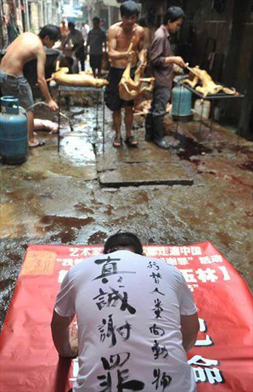 Một nhà hoạt động quỳ lạy trước một lò mổ chó