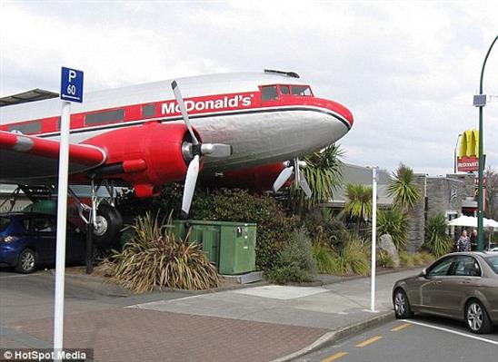 Những người yêu thích đồ ăn nhanh cũng có thể trải nghiệm cảm giác lạ tại nhà hàng McDonald, nằm trong một chiếc máy bay DC-3 cũ tại Taupo, New Zealand.