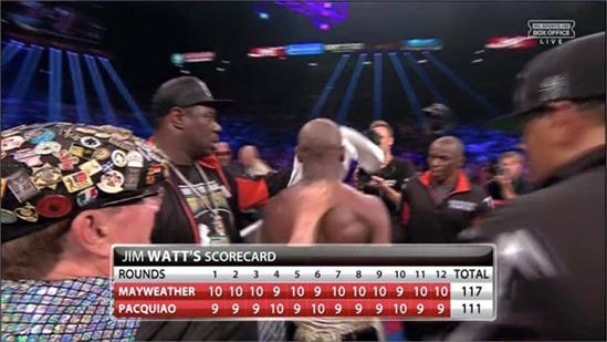 Trận đấu giữa Maywaether và Pacquiao diễn ra trong 12 hiệp, trong suốt trận đấu, võ sĩ người Philippines Pacquiao tấn công nhiều hơn trong khi Mayweather chơi khá thực dụng. Điều ngạc nhiên, trong 5 hiệp đầu, dù Pacquiao có phần áp đảo nhưng các trọng tài vẫn chấm cho Mayweather cao điểm hơn. Trong 12 hiệp, chỉ có 2 hiệp Pacquiao hơn điểm. Tổng cộng Mayweather được 117 điểm, Pacquiao được 111 điểm.