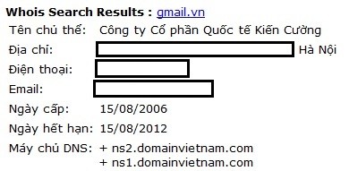 Sau khi tìm hiểu, phóng viên Dân trí nhận thấy tên miền Gmail.vn thuộc quyền sở hữu của Công ty Cổ phần Quốc tế Kiến Cường (có địa chỉ tại Hà Nội). Tên miền này được đăng ký vào năm 2006 và vừa hết hạn vào ngày 16/8 vừa qua.