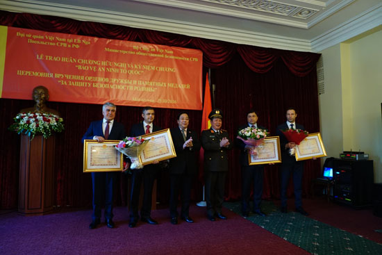 Ngày 25/10, tại trụ sở Đại sứ quán Việt Nam tại LB Nga diễn ra lễ trao Huân chương Hữu nghị và Kỷ niệm chương “Bảo vệ An ninh Tổ Quốc” của Bộ Công an Việt Nam cho tập thể các cơ sở đào tạo và các cá nhân là giảng viên, cán bộ thuộc Bộ Nội vụ LB Nga (tức Bộ Công an) và Bộ Tình trạng khẩn cấp LB Nga. Thứ trưởng Bộ Công an, Trung tướng, Tiến sỹ Bùi Văn Thành, cùng Đại sứ Việt Nam tại LB Nga, Tiến sỹ Nguyễn Thanh Sơn đã trao phần những phần thưởng cao quý này.
