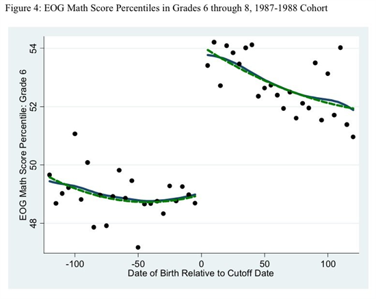 “Những sinh viên sinh ngay sau ngày quy định tuổi đi học có xu hướng thể hiện tốt hơn những sinh viên sinh trước ở môn Đọc và môn Toán cấp trung học, và có tỷ lệ phạm tội ít hơn. Mặc khác, những em sinh sau ngày quy định có tỷ lệ bỏ học trung học cao hơn và tỷ lệ phạm tội nghiêm trọng trước tuổi 19 cao hơn. Nghiên cứu của chúng tôi cũng chỉ ra bằng chứng của việc bỏ học sớm là do những đứa trẻ này có cơ hội tiếp xúc lâu hơn với những triển vọng hợp pháp của việc bỏ học”.