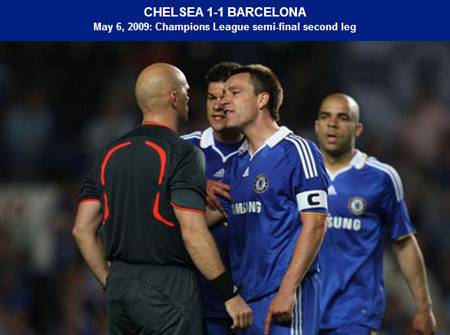Liên tiếp sau đó, Abidal phạm lõi với Drogba, Dani Alves truy cản trái phép Malouda, hay Pique, Eto’o để bóng chạm tay, nhưng không hề có 11m cho Chelsea. Và đúng ở phút cuối cùng định mệnh, Iniesta gỡ hòa với pha dứt điểm tuyệt đẹp đưa Barcelona vào chung kết (sau đó lên ngôi vô địch).