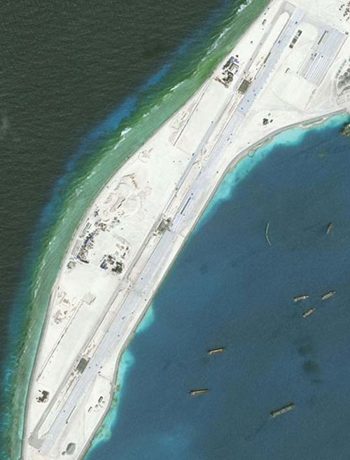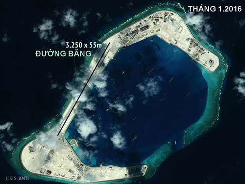Chương trình Sáng kiến minh bạch hàng hải châu Á (AMTI) của Trung tâm nghiên cứu chiến lược và quốc tế (CSIS, Mỹ) hôm 16.1 loan báo hình ảnh chụp từ vệ tinh ngày 8.1 cho thấy Trung Quốc sắp hoàn thành 2 công trình xây đường băng phi pháp dài hơn 3 km trên đá Xu Bi và Vành Khăn (ảnh) trong quần đảo Trường Sa.
