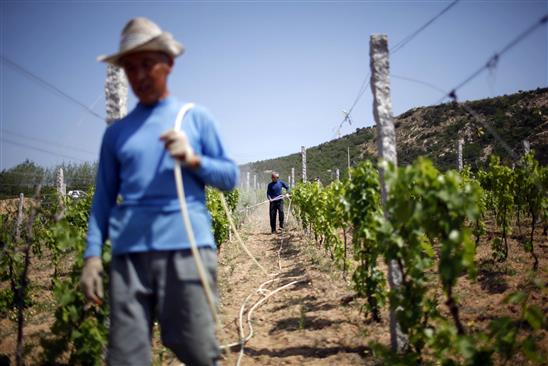 Công nhân làm việc bằng những công cuj thô sơ tại vường nho thuộc thành phố Yên Đài, tỉnh Sơn Đông. Ảnh: Qilai Shen/Bloomberg
