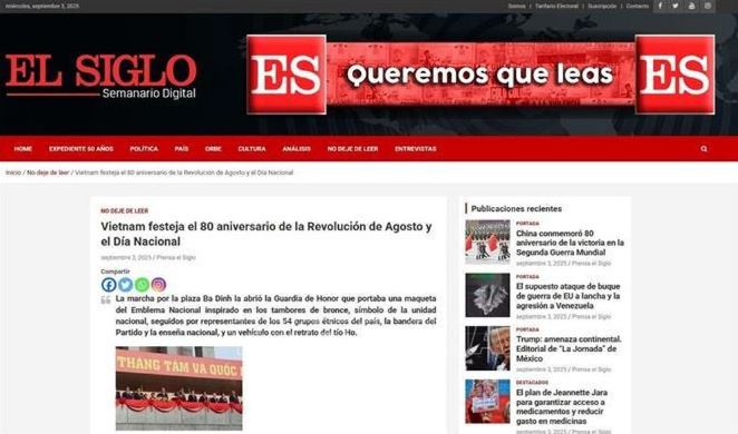Nhân dịp kỷ niệm 80 năm Quốc khánh Việt Nam (2/9/1945 - 2/9/2025), nhiều cơ quan báo chí tại khu vực Mỹ Latinh đã đăng tải bài viết tường thuật sự kiện trọng đại này, ca ngợi những thành tựu phát triển và tiềm năng hợp tác của Việt Nam.