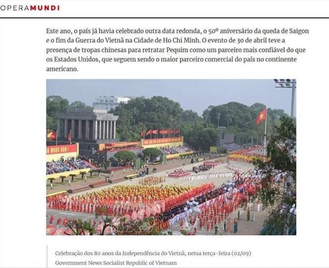 Cùng ngày, tờ Opera Mundi cũng đưa tin về các hoạt động kỷ niệm ngày Tết Độc lập của dân tộc Việt Nam trong không khí tưng bừng của lễ hội. Tờ báo tập trung đánh giá thành tựu đổi mới kinh tế - xã hội của Việt Nam, nhấn mạnh GDP từ 8 tỷ USD năm 1986 đã tăng lên hơn 476 tỷ USD năm 2024, với thu nhập bình quân đầu người đạt 4.700 USD. Bài báo đánh giá Việt Nam ngày nay là một trong những nền kinh tế tăng trưởng nhanh nhất thế giới, đồng thời đóng vai trò quan trọng ở châu Á.