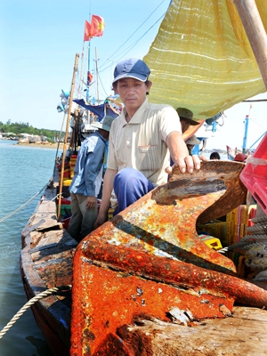 Chủ tàu Trần Văn Quang và chiếc mỏ neo bị tàu lạ đâm lút vào mũi tàu. Ảnh: Đức Nguyễn.