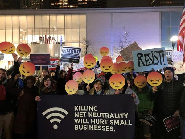 Nhiều người Mỹ cấp tiến, đại diện doanh nghiệp vừa và nhỏ tập trung bên ngoài tòa nhà của Ủy ban truyền thông Liên bang để phản đối việc bãi bỏ tính trung lập của Internet.