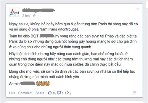 Ngay sau khi có thông tin về các vụ khủng bố, trên các diễn đàn và mạng xã hội dành cho sinh viên Việt Nam tại Pháp đã xuất hiện những khuyến cáo cho các thành viên.