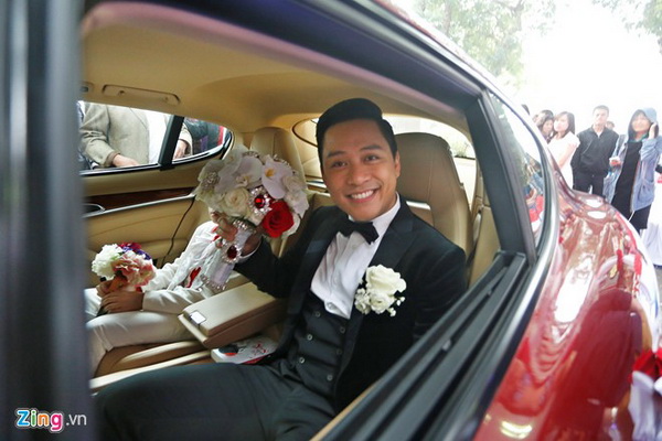 Tuấn Hưng bảnh bao trên xe hoa. Anh được một phù rể nhí tháp tùng khi đi đón dâu.