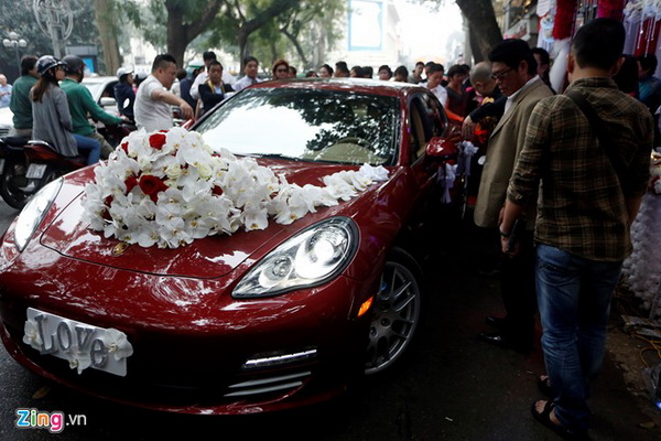 Chiếc xe Porsche màu đỏ được sử dụng làm xe rước dâu. Tuấn Hưng đề nghị trang trí xe hoa bằng lan trắng và hồng đỏ. Biển xe được thay bằng tấm bảng dễ thương với chữ "Love" ánh bạc.