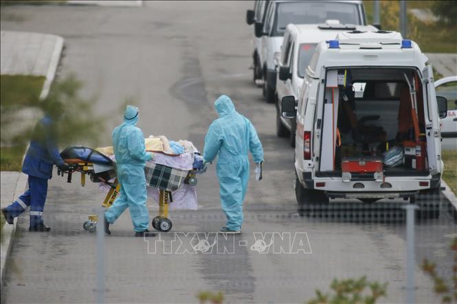 Nhân viên y tế chuyển bệnh nhân nhiễm COVID-19 tới bệnh viện ở ngoại ô Moskva, Nga.