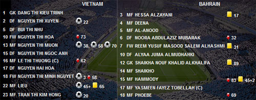 Tuy nhiên, khi bước vào trận đấu trên sân vận động quốc gia Bahrain, tuyển nữ Việt Nam đã chơi hoàn toàn trên cơ. Ngay trong hiệp một, chúng ta đã dẫn đội bạn 5-0. Sang hiệp hai, các học trò của ông Trần Vân Phát ghi thêm 3 bàn và giành thắng lợi chung cuộc 8-0.