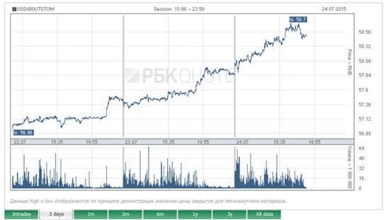 Vào cuối buổi chiều nay, tỷ giá USD trên sàn ngoại hối Moskva vẫn tiếp tục tăng đến đỉnh 58,7 rúp/USD và sau đó giảm nhẹ xuống 58,5 rúp/USD, trong bối cảnh giá dầu Brent vào lúc 18:24 (giờ MSK) rớt xuống mức 54,74 USD/thùng.