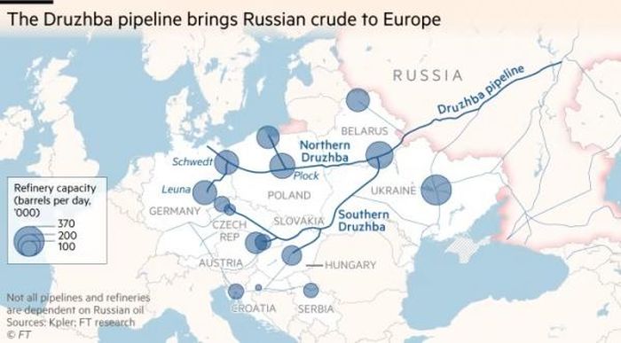 Sơ đồ toàn tuyến đường ống dẫn dầu Druzba. Đồ họa: FT