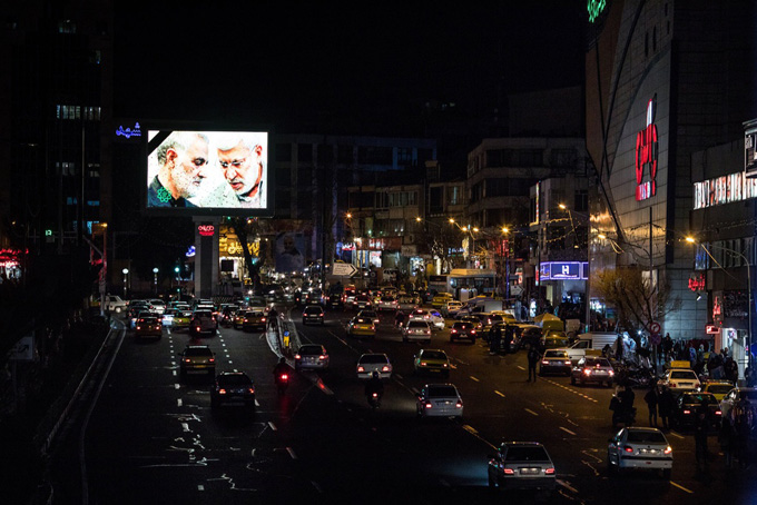 Một bảng quảng cáo ở Tehran có hình tướng Soleimani (trái) và quan chức Iraq phụ trách dân quân và thân cận với Iran, Abu Mahdi al-Muhandis, người cũng bị giết trong cuộc tấn công bằng máy bay không người lái. Ảnh: New York Times.
