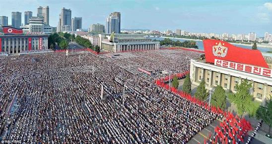 Đám đông tập trung bên ngoài quảng trường Kim Nhật Thành ở thủ đô Bình Nhưỡng hôm 9.8 với băng rôn, khẩu hiệu rợp trời. Người Triều Tiên giơ nắm tay lên trời thể hiện ý chí phản đối và bày tỏ sự trung thành với lãnh đạo tối cao Kim Jong-un.