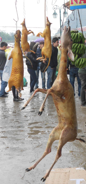 Ngày 18.2.2014, ông Douglas Hendrie - một chuyên gia bảo tồn tâm huyết người Mỹ đang làm cố vấn cho ENV và bà Nguyễn Phương Dung - Phó Giám đốc ENV cùng các “điệp viên” chống lại tình trạng giết hại động vật ở Chùa Hương rủ tôi lên đường “trẩy hội”. Phải nói rằng, chiến dịch làm “thanh sạch” lễ hội năm qua của ENV đã nhận được sự ủng hộ lớn trong dư luận, báo chí, song ở góc độ hiệu quả thì vẫn như húc đầu vào đá. Vừa đến bãi ôtô, tức là khu bến đò để chuẩn bị đi dọc suối Yến, ông bạn Tây của tôi đã choáng váng không biết ngồi đâu, ăn ở đâu, nói gì, khi mà nhìn đâu cũng thấy động vật bị tàn sát, chủ quán xưng xưng giới thiệu thú rừng, cầy hương, chồn cáo “rừng xịn 100%”. Con vật nhia răng trắng nhởn, sạch lông, thui vàng, để “nguyên chiếc” trên khay, trông rất rùng rợn.