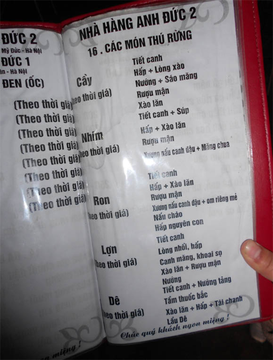 Trong ngày 18.2.2014, trong 45 nhà hàng được khảo sát điều tra, thì 37 “địa chỉ” vô tư bán thịt động vật mà hầu hết chủ nhà hàng đều khẳng định chắc nịch, rồi biển hiệu ghi rõ là ĐVHD. “Nét mới” duy nhất là năm nay một số nhà hàng có để thú rừng sau lớp kính mờ mờ. Mờ một chút thôi, vẫn quá đủ bắt mắt. Nhiều nhà hàng thái sẵn các khay thịt thú đỏ đọc, vàng ruộm rồi cắm “biển” thịt nai, thịt sóc, thịt nhím, thậm chí thịt “rừng” hẳn hoi. Đặc biệt, phớt lờ công văn của UBND TP.Hà Nội, rất nhiều nhà hàng vẫn treo cả con nai, con hươu to như… thây người, lông đầu lông đuôi còn nguyên, con vật tội nghiệp bị mổ phanh, tứ chi bị đẽo gọt nham nhở đỏ quạch máu, xương sườn cái bị “gặm”, cái còn nguyên lớp da thui vàng. Cảnh tượng trông còn kinh dị hơn năm trước.