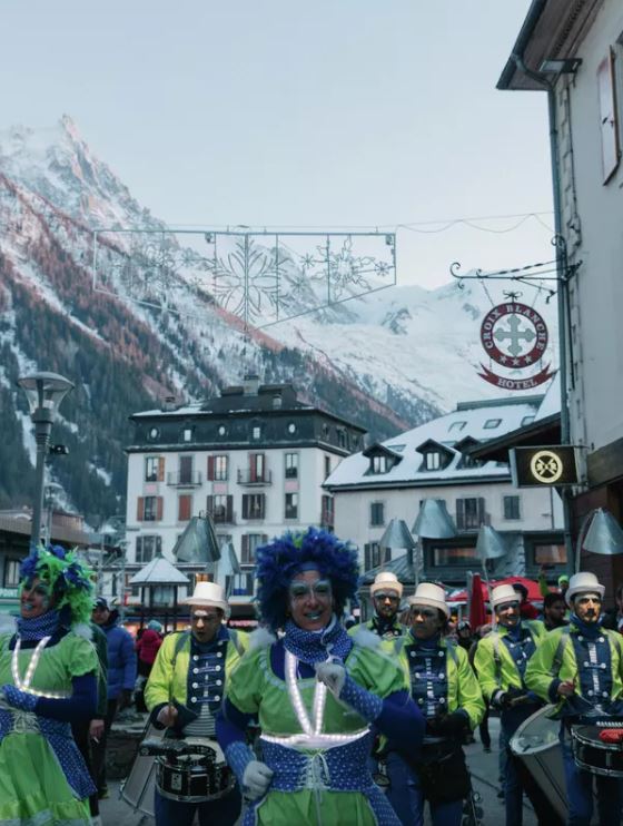 Các vũ công và nhạc công diễu hành trên những con phố phủ tuyết trắng tại Chamonix, Pháp. CC BY-SA 4.0 / Ben Meyer / Folk Celebrations in Chamonix (cropped image)